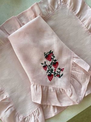 O elemento central do conjunto é o bordado de morangos, aplicado com cuidado artesanal. Este detalhe traz frescura, delicadeza e um imaginário ligado à natureza e aos pequenos prazeres: mesas primaveris, almoços longos, flores frescas e momentos partilhados sem pressa. O bordado acrescenta personalidade às peças sem as tornar excessivas, permitindo combinações versáteis com diferentes estilos de louça.