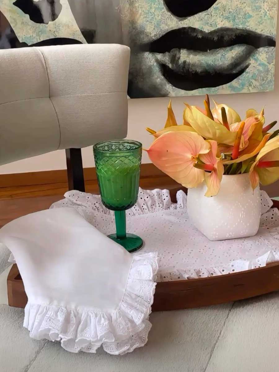 Este branco combina com tudo. Com a louça colorida que traz alegria à mesa de domingo. Com a porcelana fina de ocasiões especiais. Com a cerâmica artesanal rústica de um jantar íntimo. É um branco que serve de fundo e que, ao mesmo tempo, rouba o olhar — precisamente porque o bordado inglês lhe dá textura, profundidade e carácter.