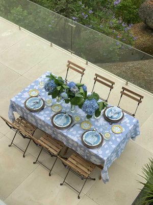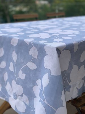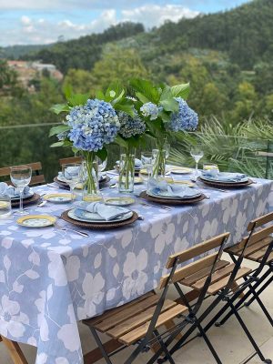 A Toalha Gardénia, em ponto aberto, é um elogio à beleza natural. Com um padrão floral suave em tons de azul e branco, evoca a leveza das hortênsias e o frescor dos dias de verão. Feita em linho, é perfeita tanto para refeições ao ar livre como para jantares em casa que pedem uma mesa cuidada.